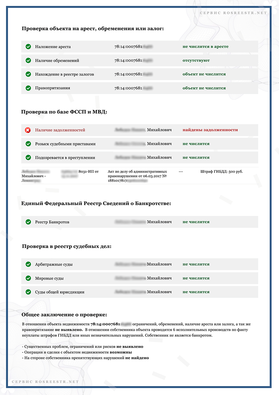 Сервис проверит квартиру на юр. чистоту, наличие залогов, обременений. Наличие права владения и долгов у собственника.