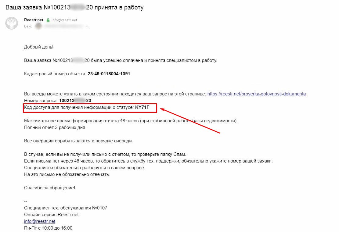 Номер заявки вводится в формате ХХХХХХХХ-ХХ и его можно найти в электронном письме, либо в СМС сообщении, которое отправляется вам сразу после оплаты заказа. Так же необходимо ввести код доступа для отображения информации. Он высылается в письме и СМС вместе с номером заявки.